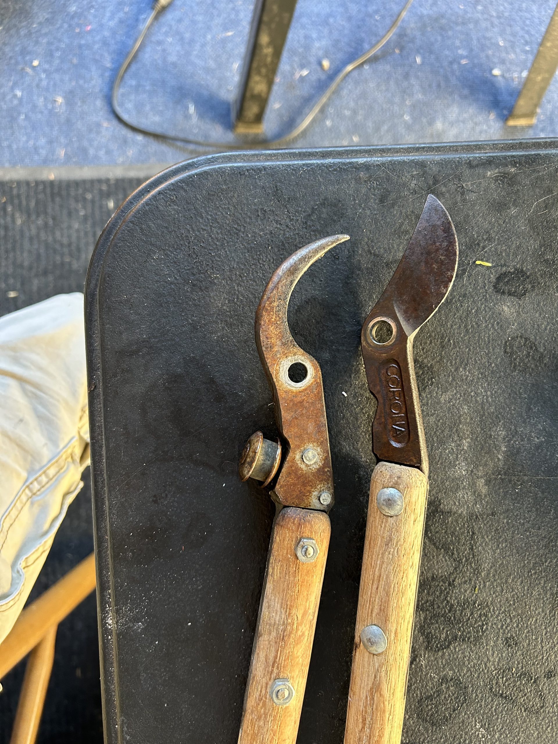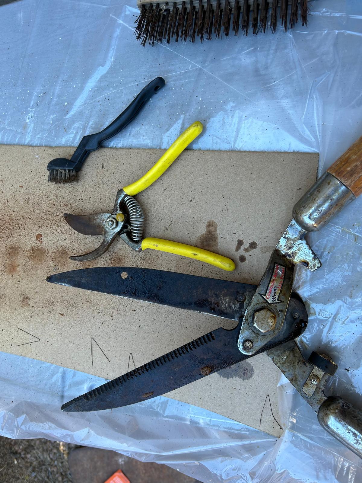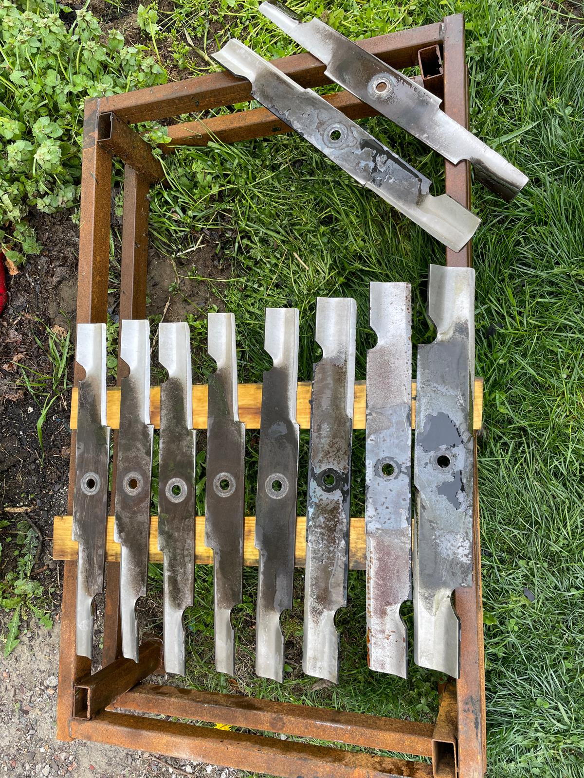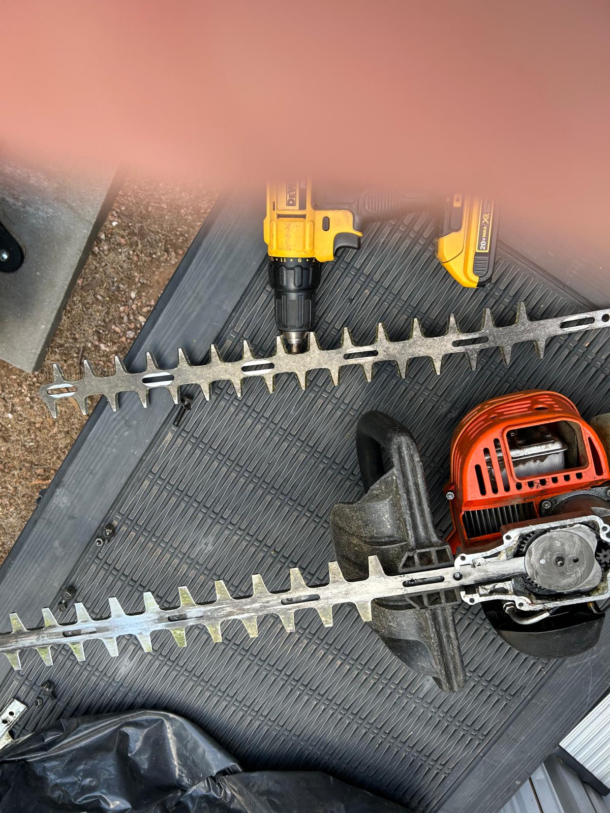 Landscaping Tools: Lawnmower blades, hedge trimmers, chainsaws, pruning shears, loppers, shovels, and hoes.