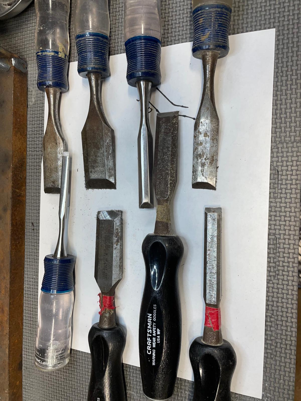 Carpentry Tools: Chisels, planer blades, saw blades, router bits, and woodturning gouges.